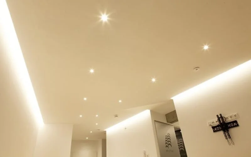 Wir entfernen ihre alte Decke, kümmern uns um die Entsorgung und bauen eine moderne, glatte, weiße Dobau-Kopka Decke mit integrierten LED-Spots ein